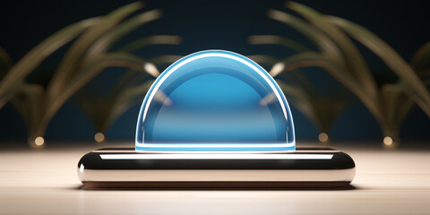 Hi-tech elegant futuristic style table stand on metallic podium for electronic product display presentation. Studio background with plants