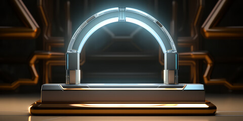 Golden glass arch podium in a empty hall. Product present placement pedestal promotion display