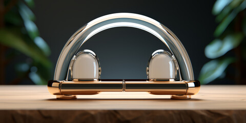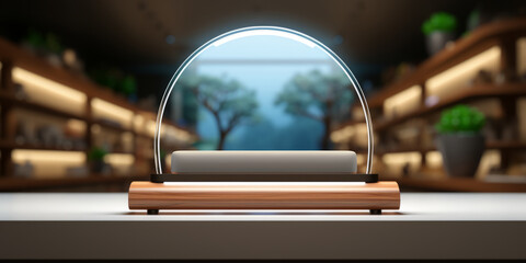 Hi-tech elegant futuristic style table stand on wooden podium for electronic product display presentation. Studio background with plants