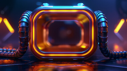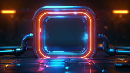 Futuristic glowing industrial pipes with scifi screen, blue and orange neon lights