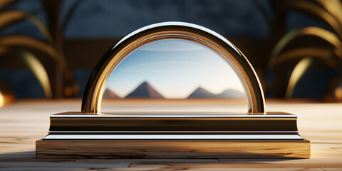 Golden glass arch podium in a empty hall. Product present placement pedestal promotion display
