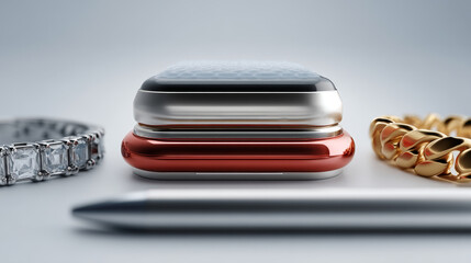 youre viewingElegant Collection of Luxury Rings and Smartphone on Marble Surface – Modern Wealth and Sophistication Concept