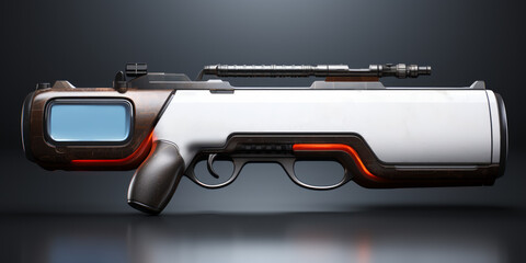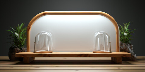 Hi-tech elegant futuristic style table stand on wooden podium for electronic product display presentation. Studio background with plants